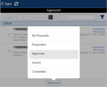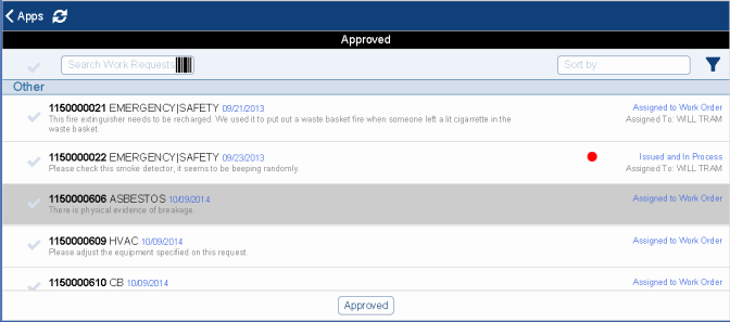Supervisors using the Maintenance app use the menu at the bottom of the screen to process work at the various stages. For example, to see all approved requests, select the Approved option. Users working with the Maintenance Console are accustomed to seeing all their work in one console, grouped by status; in the mobile environment, users use the menu to toggle between the various status tabs.