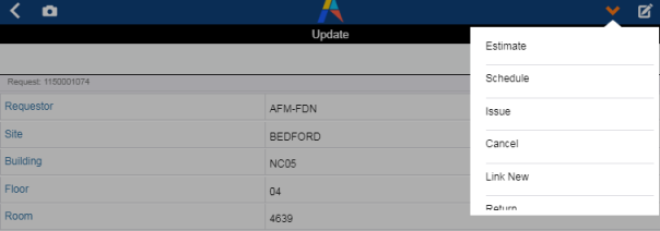The supervisor uses the drop-down menu at the top of the screen (shown below in the "Supervisor Tasks" section of this topic) to process work at each stage and change the status of the work. As the work request is updated and the supervisor syncs, the work request status changes and the request moves from one tab (such as Approved) to another (such as Issued).