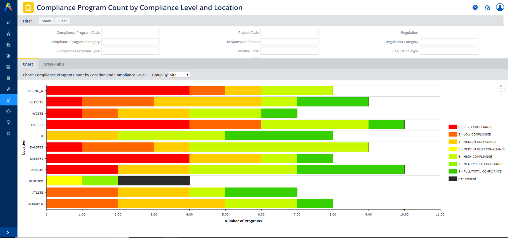 - Track and manage your compliance programs by providing multiple operational and management reports, including charts, and EIS reports that show your compliance programs on a map.
