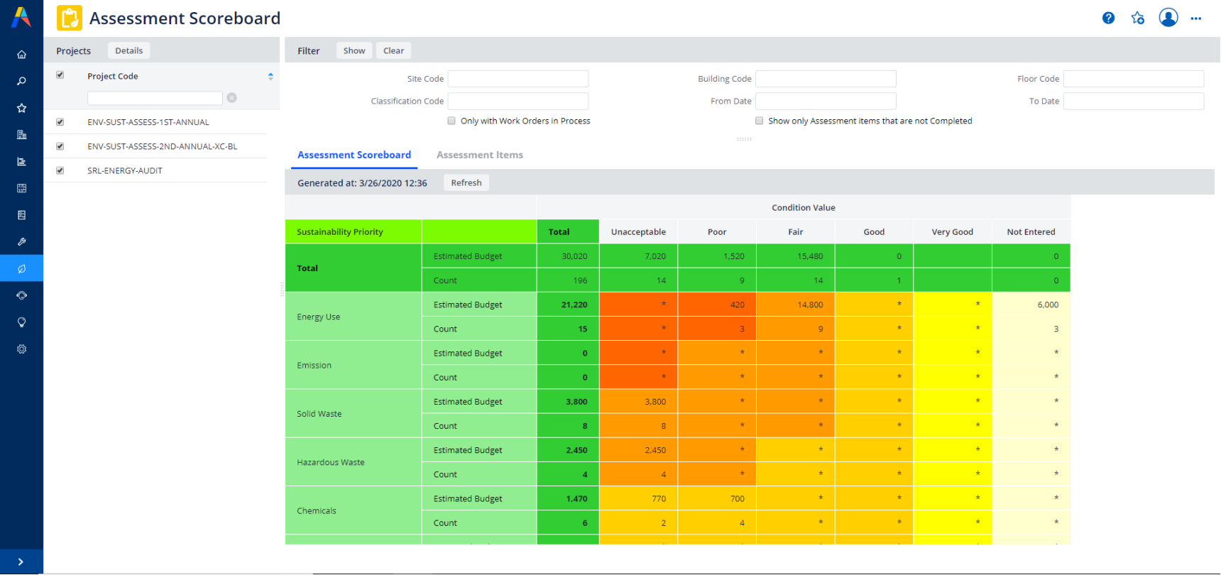 Environmental Sustainability Scoreboard Assessment Project Statistics by Location Building Sustainability Summary Assessments with Sustainability Ratings Greater than 25 Open Energy Issues Work Request Summary by Active Assessment Items Work Request Statistics by Assessment Project Unacceptable Assessment Items by Priority Costs and Ratings by Classification ... reports Equipment Assessment by Level 3 Classification Highlight Locations with Issues ... reports |