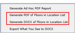 - Click the Export button, located in the floor plan ribbon. Click "Generate PDF of Floors in Location List" or "Generate DOCX of Floors in Location List." Note that if you generate a DOCX, labels are not included.