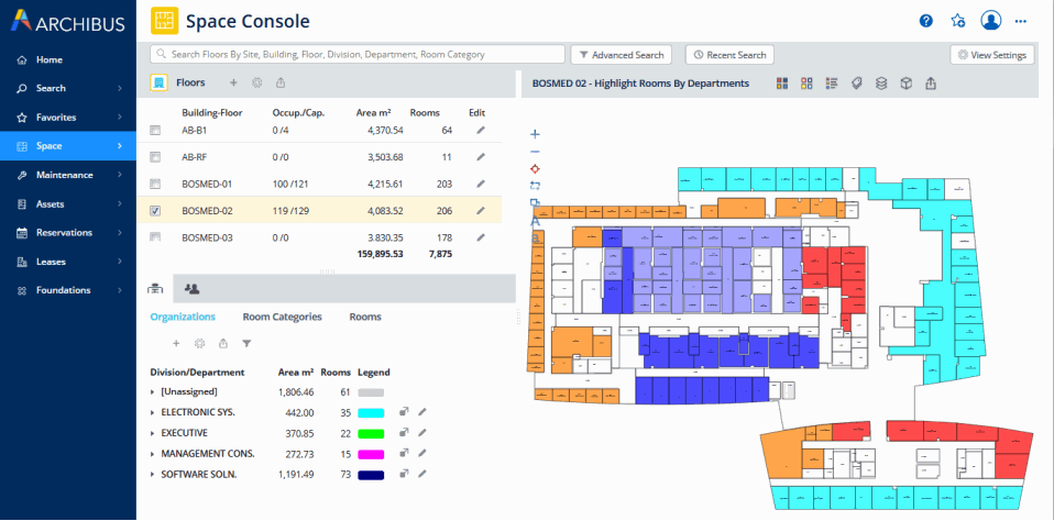 For example, the above image shows that a user has selected the "Highlight Rooms by Department per Floor" task to obtain a view into the room allocation data stored in the Archibus data repository. When the user selects the task, Web Central loads a view that: