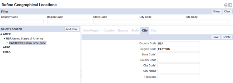 The view uses drill-down selection lists to present the levels of the hierarchy. For information on working with this, see Using Drill-Down Selection Lists. When you drill down to a selection and then add new values, the view pre-fills the form with the values of your drill-down selection. For example, you can drill down to a region and then use the Add New button to add a city: as shown in the below image, the form is pre-filled with the dril-down selection.