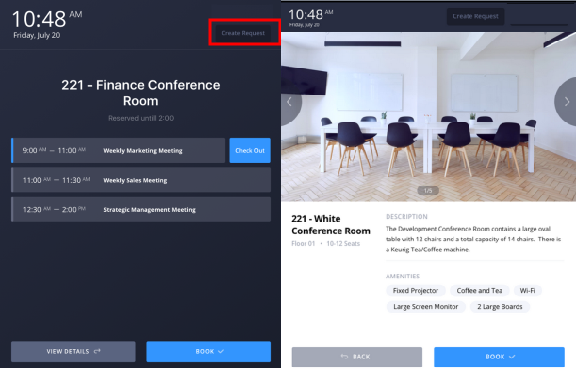 - An employee realizes that they need a conference room later in the day. They stop by the desired room, and check the kiosk for the room's availability for today. They see it is available later in the day and use the kiosk to reserve it for the afternoon.