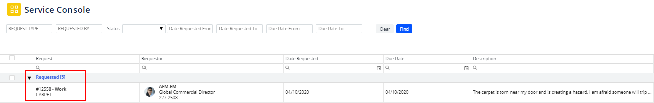 - Sign in as AFM-FDN and load Service Console. You will see the request that AFM-EM just made. Note that this is a maintenance request, as indicated by the "Work" prefix in the service request number. Select the item and you will access the Work Request Details form, where you can see the generated work request number.
