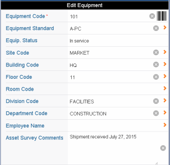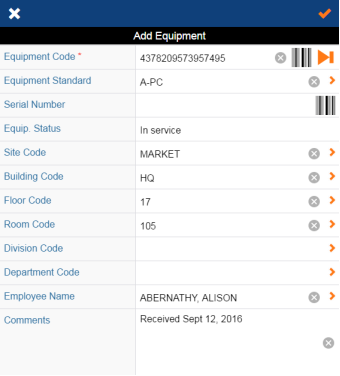 - enter new items: If an item has a bar code attached to it, mobile users can scan the tag with their devices, The system will complete the Equipment Code field with the tag's value.