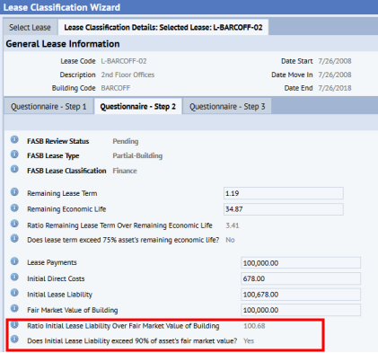 A common use case for revisiting your right-of-use options is to reduce the value of the Ratio of Initial Liability Over Fair Market Value of the Asset. When you work through the Wizard's Step 2 tab, the system calculates this value. If this value is less than 90 percent, you have an operating lease. If the value is over 90 percent, you have a finance lease. However, you might be able to reduce this value by including right-of-use options.