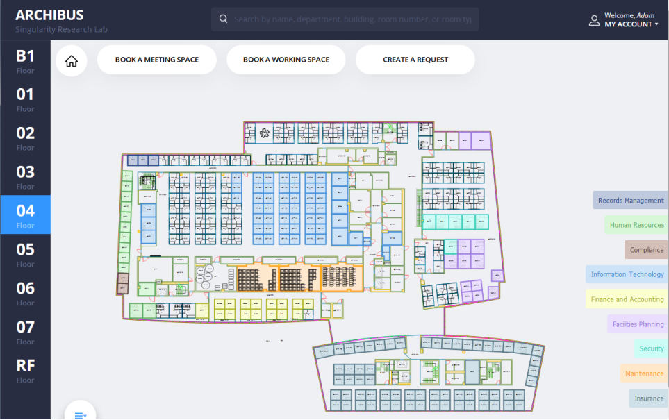 - search for a department and examine on a floor plan all the space assigned to this department