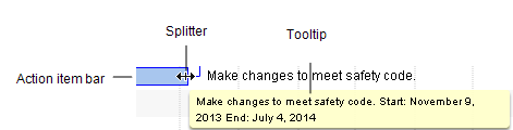 - Click and drag the splitter on the timeline to expand or contract the time allotted to the action. You can click and drag either end of the action icon to change either the start or the end date, or you can click the splitter when it is in the middle of the action icon to change the start and end dates at the same time. As you click and drag, a tooltip shows the adjusted start and end date, and the duration. Note that the Duration shown in this tooltip is not adjusted for the number of working days.