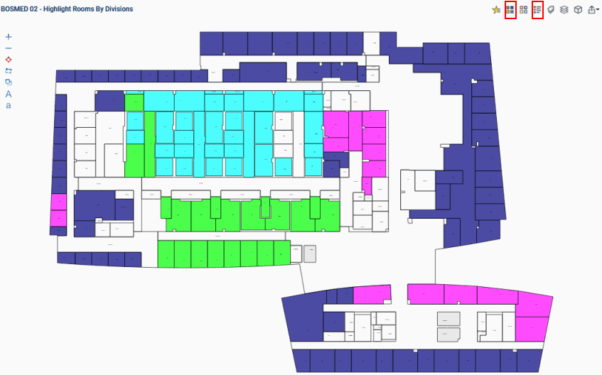 - In the Highlights option in the floor plan ribbon, choose Divisions. The system highlights rooms according to the colors associated with their division. Rooms without colors are not assigned to a division.