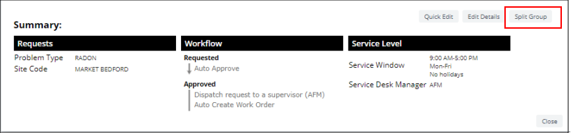 - Click Split Group at the top of the form. This button appears only when the SLAs are grouped. For example, the below SLA grouping for RADON applies to both the MARKET and BEDFORD sites, and can therefore be split. Accordingly, the Split Group button appears on this Summary form.