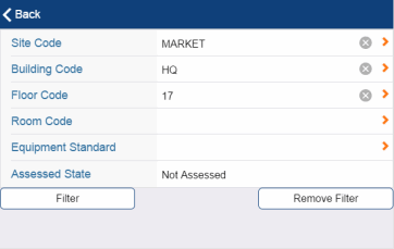 For example, with the above filter options, the field assessor will see in the Assessment Items list only uncompleted assessment tasks for floor HQ-18. For more information on filters, see Searching and Filtering.