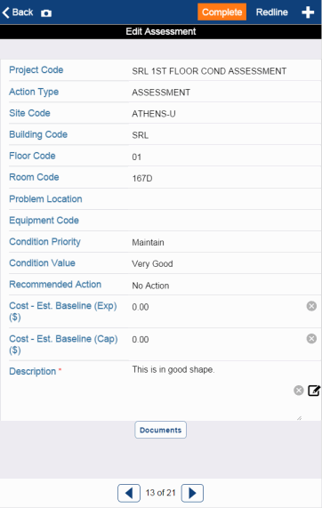From the list of assessment items, the field assessor taps an assessment item (or taps on a room on the floor plan) to see the details of the item in the Edit Assessment screen, shown below. The assessor then travels to the location of this item and assesses its current state. For example, the assessor can note the general condition, recommended action, the cost to replace, and so on. For information on the values that the field assessor can choose for the priority and value fields, see Field Assessor / Documenting the Condition and Sustainability of Rooms and Equipment.