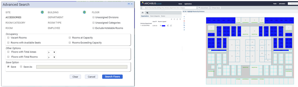 Often, you need to locate floors that meet a very specific search criteria. For example, you might want to search for vacant rooms with certain room attributes so that you can place new employees close to their colleagues in the same departments.