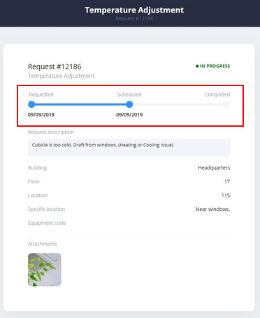 Self-service requestors can now click on a request to open a details panel with a status bar showing date requested, date scheduled, and date completed. Being able to follow up on requests in an efficient manner improves the experience of the self-service user and empowers them to use Workplace in the future.