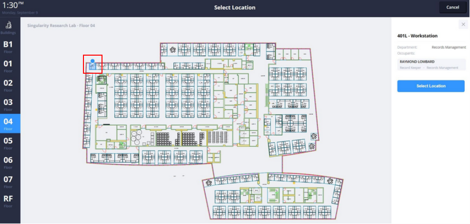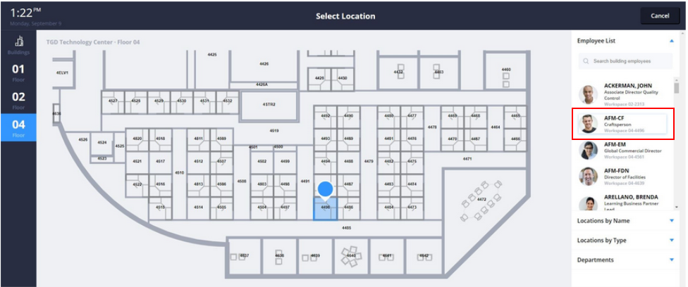 Once you select the location, you can access details about the room, such as the employee occupying it. You can also use the Employee List to check the location of other employees.