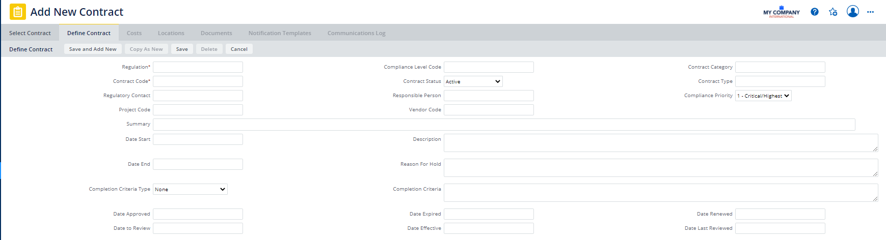4. Enter the following information, which will create a record in the "Compliance Programs and Contracts" table (the regprogram table).