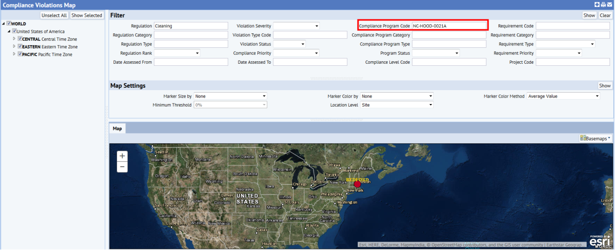 - The locations must have violations associated with them, as the drilldown list for locations shows only locations that have violations. You must enter a site location for a violation to view the violation on this map. See Managing Compliance Violations.