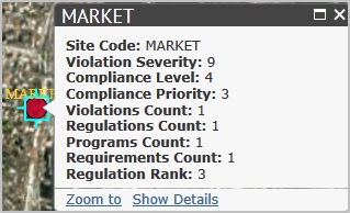 - When you click the marker, a pop-up window identifies the location, the violation severity, Compliance Level, Compliance Priority, Regulations Count, Compliance Programs Count, Requirements Count, and Regulation Rank. The values for Level, Priority, and Rank are computed for the location depending on the selections for the marker symbol and filters you select. See the below section About Marker Symbol Selections.