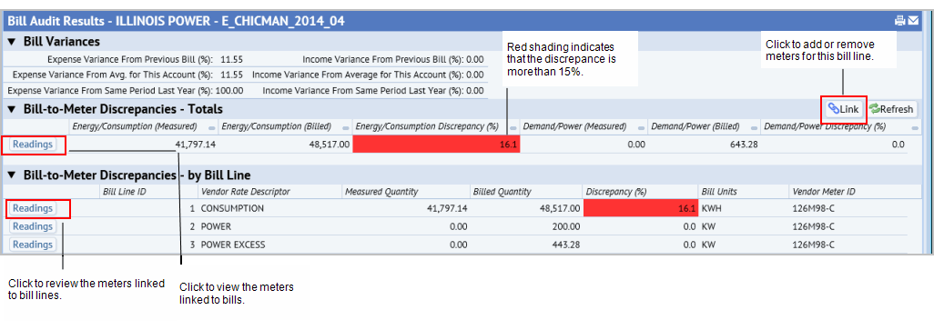 - To review the meters linked to a bill line, from the Bill Audit Results form, click Readings in the row for the bill line.