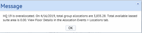 The application uses the value for Floor Area, whether derived form the Suites table or the Floors table, to determine whether a floor has been over-allocated. Over-allocation means that the total for allocation events on any date exceeds the available floor space for that date. Clicking the icon gives the Message shown below that provides details about the allocated floor space. You can also view details by expanding the buildings shown in the Locations tab, and clicking Details in the row for the over-allocated floor.