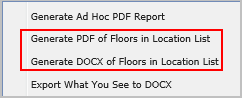 - Click the Export button, located in the floor plan ribbon. Click "Generate PDF of Floors in Location List" or "Generate DOCX of Floors in Location List." Note that if you generate a DOCX, labels are not included.