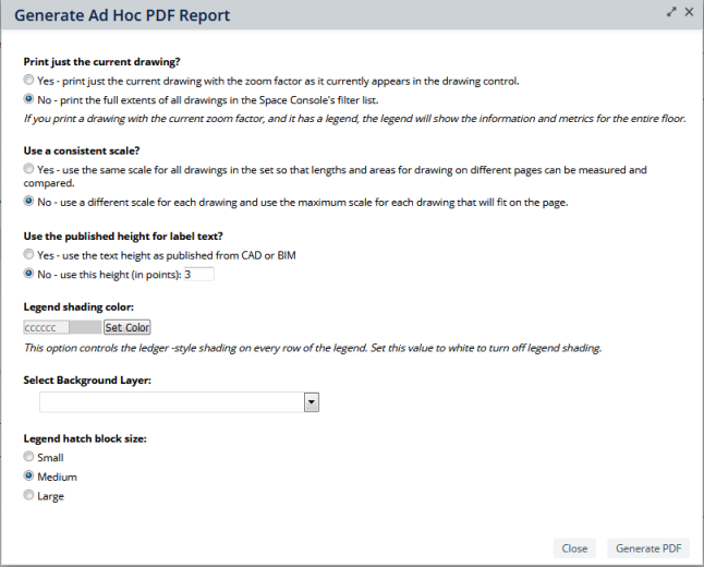 Note: This topic covers the basic features of exporting drawings for printing to PDF or DOCX. For a complete description of the features including selecting background layers to export, or making ad hoc adjustments to a drawing, see Options for Printing Drawings from the Space Console.